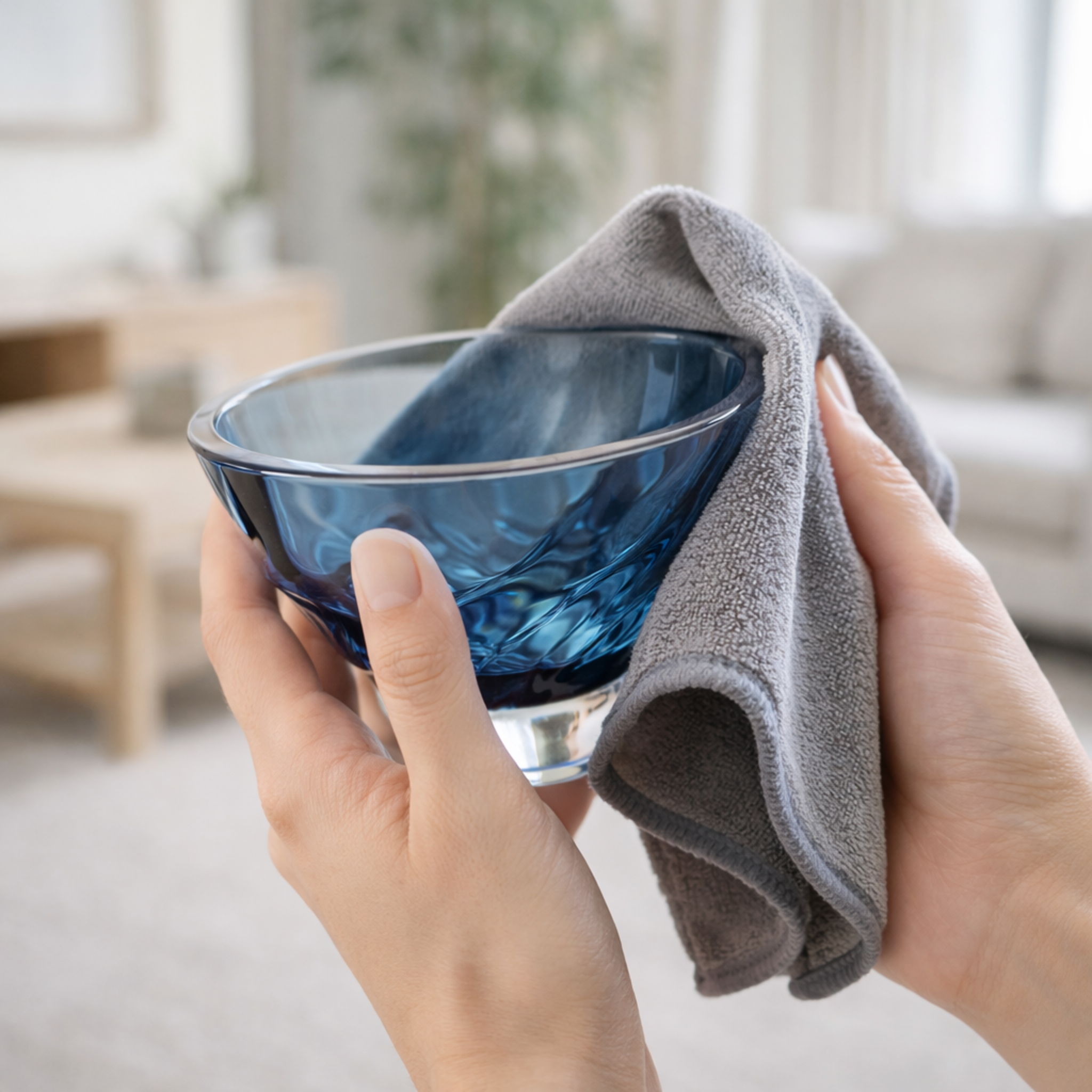 Máte skleněnou mísu nebo vázu vystavenou na polici a potřebujete ji jen zbavit prachu? Sáhněte po měkkém hadříku, nejlépe z mikrovlákna, který nepouští chloupky. Sklo tak zůstane krásně čisté a lesklé bez šmouh.
